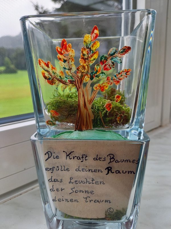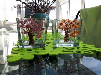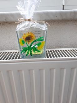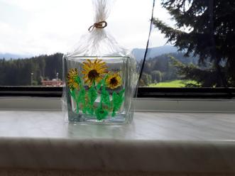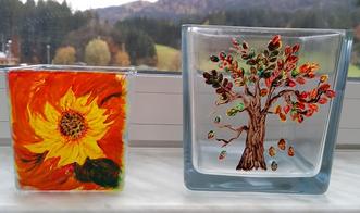 Die Teelichtgläser werden von Frau Anzengruber handbemalt und zusätzlich mit Gedichten versehen.