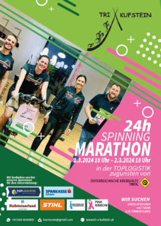 01. - 02. März von 18 Uhr bis 18 Uhr findet der 24h Spinning Marathon in Kufstein statt. Es ist eine Gruppen- oder Einzelteilnahme möglich. TOPLOGISTIK stellt Verpflegung bereit. Der 24h Spinning Marathon findet im Fitnessraum der Toplogistik Kufstein - Willy-Graf-Str. 14 - Kufstein statt.
