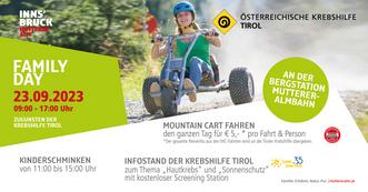 Wir freuen uns, den bevorstehenden Family Day ankündigen zu können, der am 23. September 2023 stattfinden wird. Diese besondere Veranstaltung wird in Zusammenarbeit mit der Muttereralmbahn organisiert, um Spenden für diese wichtige Organisation zu sammeln und gleichzeitig einen unterhaltsamen Tag für Familien zu bieten. Der Reinerlös aus den Fahrten der Mountaincarts am Family Day wird der Krebshilfe Tirol zugutekommen, einer Organisation, die sich der Unterstützung von Krebspatienten und deren Familien widmet. Die Spenden werden dazu beitragen, wichtige Programme und Dienstleistungen anzubieten, um den Betroffenen während ihres Kampfes gegen den Krebs beizustehen. Wir freuen uns auf euren Besuch.