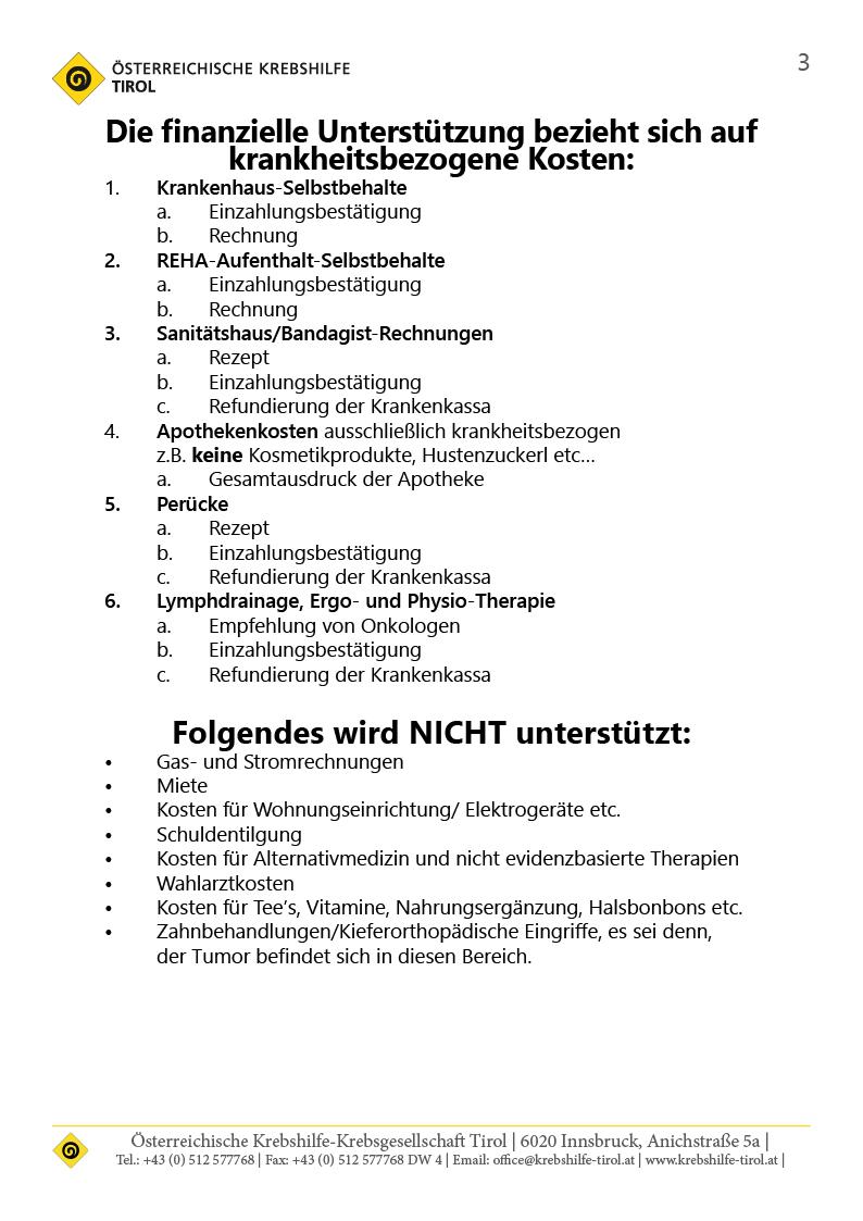 - Nachweis jener Kosten/zusätzlicher Ausgaben, die aufgrund der Krebserkrankung entstanden sind und zu der Notlage führten.