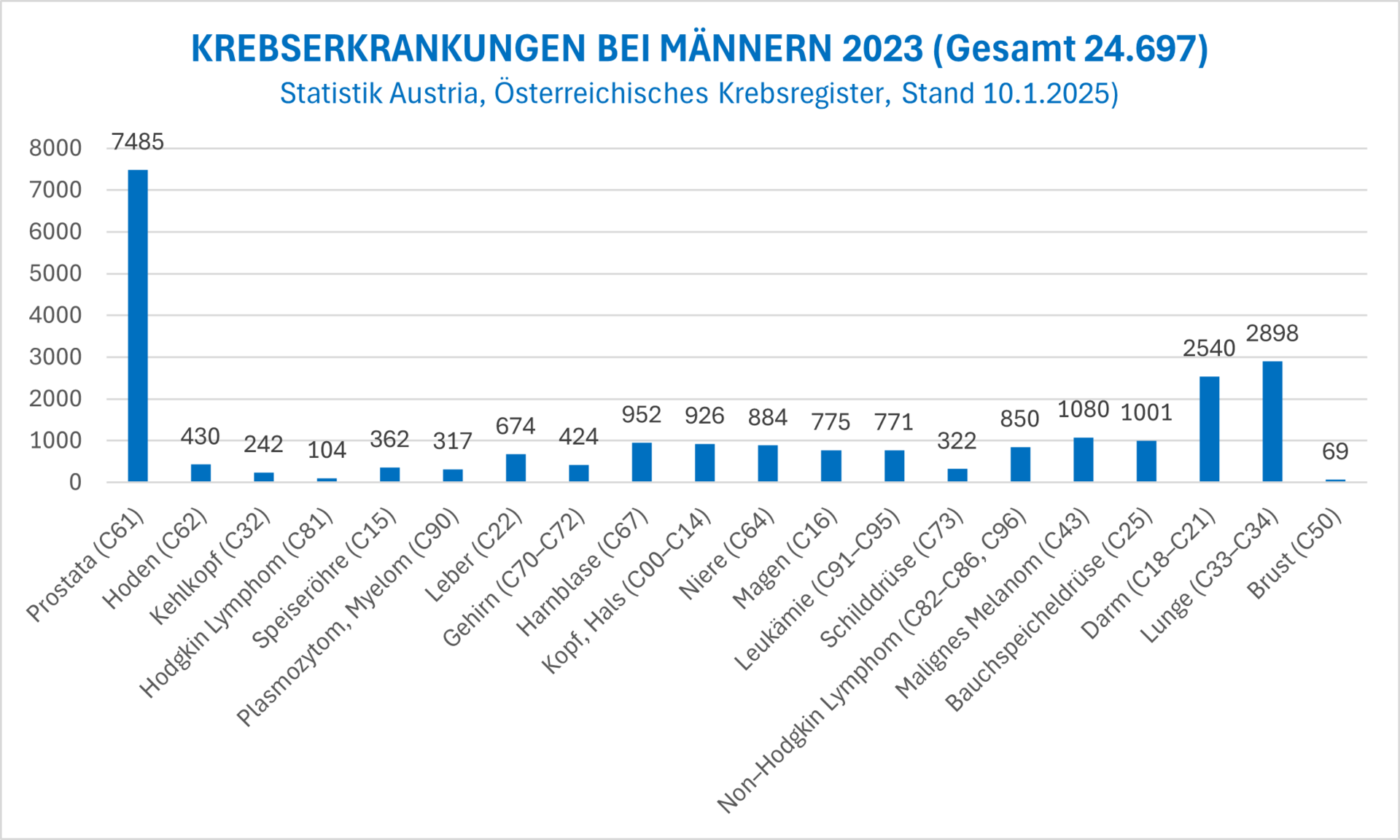 Das Gesamtbild der Neuerkrankungen ist im Vergleich zu den Vorjahren unverändert. 2023 erhielten in Österreich 21 821 Frauen und 24 697 Männer eine Krebsdiagnose. Die häufigsten Diagnosen waren bösartige Tumore der Brust bei Frauen (6 902 Fälle) und bösartige Tumore der Prostata bei Männern (7 485 Fälle), gefolgt von bösartigen Tumoren der Lunge (5 232 Fälle, beide Geschlechter zusammen) und bösartigen Tumoren des Dickdarms bzw. Enddarms (4 690 Fälle, beide Geschlechter zusammen). Auf Brustkrebs entfielen 2023 rund 32 % der Neuerkrankungsfälle bei Frauen sowie 17 % aller Krebssterbefälle. Damit war Brustkrebs bei Frauen auch die zweithäufigste krebsbedingte Todesursache. Prostatakrebs machte ein knappes Drittel (30 %) aller 2023 neu diagnostizierten bösartigen Neubildungen bei Männern aus und war 2023 für etwa jeden achten Krebstodesfall (13 %) bei Männern verantwortlich. Lungenkrebs stand 2023 mit 2 334 Fällen (11 %) bei Frauen und 2 898 Fällen (12 %) bei Männern jeweils an zweiter Stelle der Krebsneuerkrankungen. Mit etwa jedem fünften Krebssterbefall nahm Lungenkrebs bei beiden Geschlechtern den ersten Rang unter den krebsbedingten Todesursachen ein (18 % bei Frauen und 21 % bei Männern). Nachdem das Erkrankungsrisiko zuvor bei Frauen stark zugenommen hatte, blieb es – ebenso wie das Sterberisiko – in den letzten Jahren relativ stabil. Die dritthäufigste Lokalisation bei den Neuerkrankungen 2023 war Dickdarmkrebs mit 2 150 Fällen bei Frauen und 2 540 Fällen bei Männern (jeweils 10 %). Dickdarmkrebs war für rund 10 % der Krebssterbefälle verantwortlich. Bezogen auf die Bevölkerung ist das Risiko einer Darmkrebserkrankung für Frauen deutlich geringer als für Männer. Das Erkrankungsrisiko sank in den vergangenen Jahren für Männer, bei Frauen blieb es seit 2017 stabil. Detaillierte Ergebnisse bzw. weitere Informationen zur Krebsstatistik finden Sie auf www.statistik.at